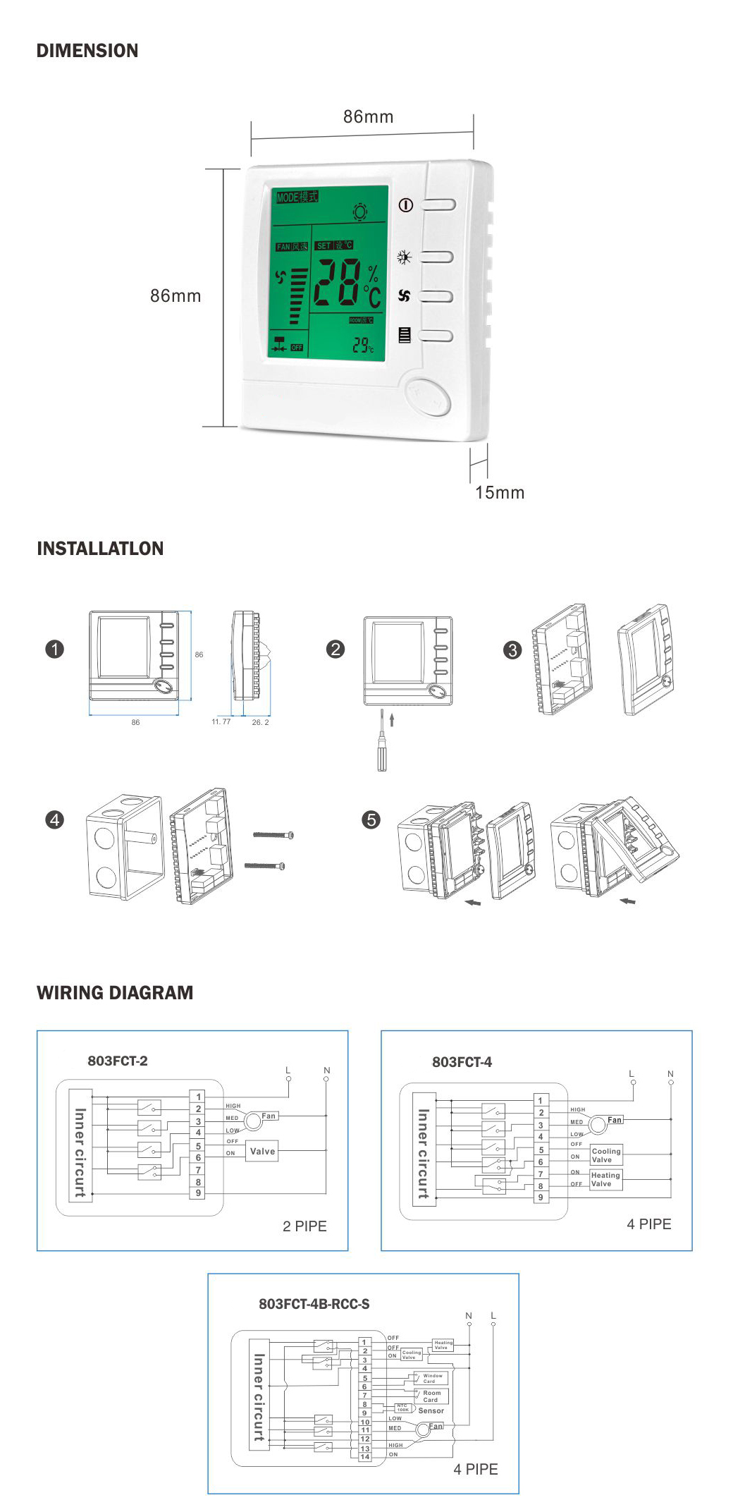 The 803FCT/2 Series of Digital thermostats are specifically designed for control of commercial heating and cooling equipment such as rooftop units (with and without economizers), heat pumps, and fan coil unit. The large LCD display is easy to set up and program through the use of a plain text menu driven backlit display that walks the user